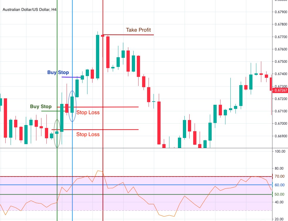 - Cuando el RSI supere el nivel 60, coloca la segunda orden. El Stop Loss se debe colocar 5-10 pips por debajo del mínimo local.